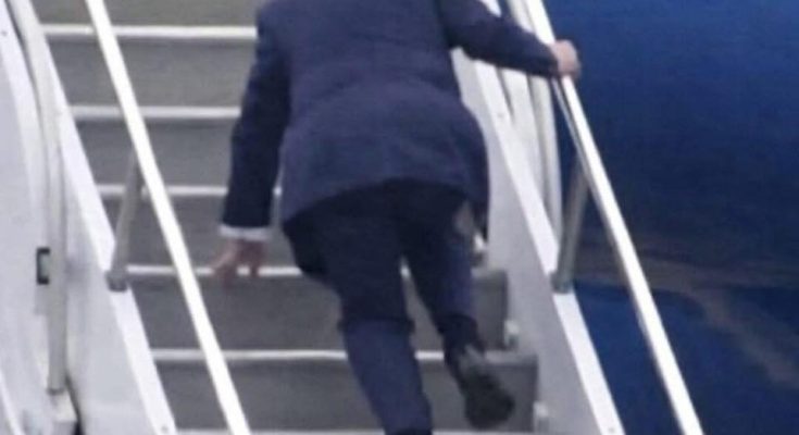 May be an image of text that says 'Donald Trump falls on the stairs while boarding Air Force One...'